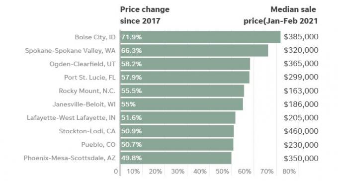 이에 따르면 아이다호의 보이스시티에서 중간판매가격이 22만4000달러에서 38만5000달러로 올라 72%의 상승률을 기록해 1위를 차지했다.