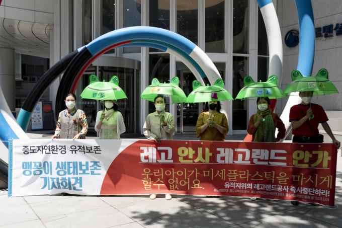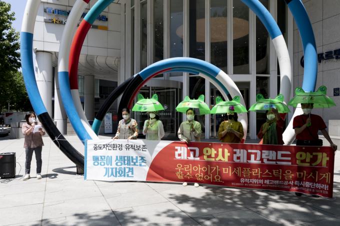 중도생명연대 등 시민단체 관계자들이 4일 서울 강남구 레고코리아 본사 앞에서 '춘천 중도 레고랜드 공사 관련 맹꽁이 생태보존과 유적 보존 촉구' 기자회견을 하고 있다.