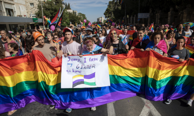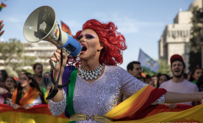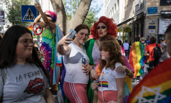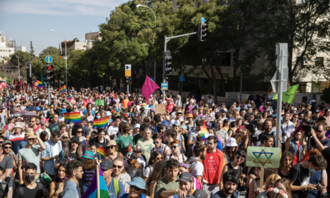 3일(현지시간) 이스라엘 예루살렘에서 열린 게이 퍼레이드. 한 참가자가 확성기를 들고 구호를 외치고 있다. [AP 뉴시스]