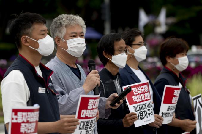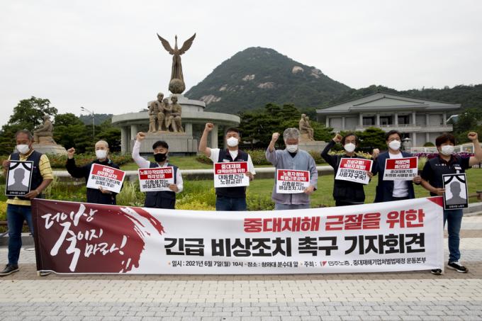 지난 5월 평택항에서 근무중 컨테이너 철판에 깔려 숨진 故 이선호 씨의 아버지 이재훈(왼쪽 두번째) 씨가 7일 오전 청와대 분수대 앞에서 열린 '중대재해 근절을 위한 긴급 비상조치 촉구' 기자회견에 참석해 발언하고 있다.