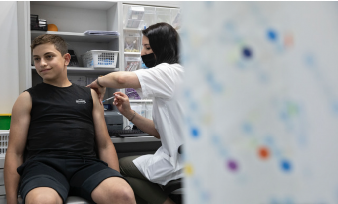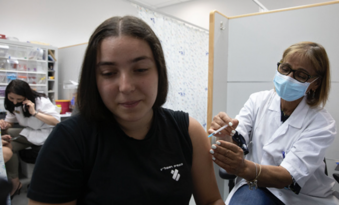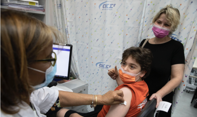 6일(현지시간) 이스라엘 텔아비브 인근의 코로나19 백신 접종소에서 한 어린이가 백신 접종 후 '엄지 척'을 하고 있다. 이스라엘은 12~15세 어린이를 대상으로 코로나19 백신 접종을 시작했다. [AP 뉴시스]