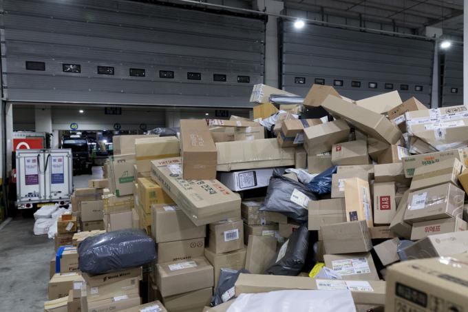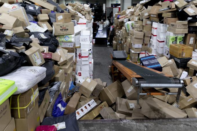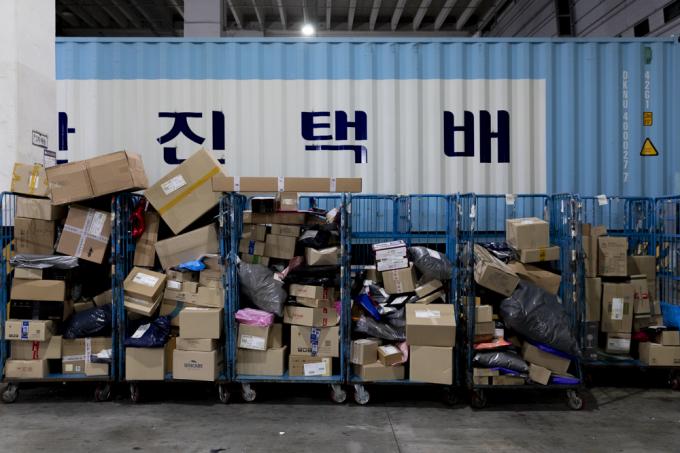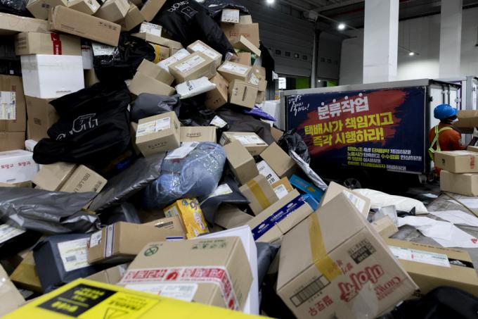 전국택배노조가 무기한 파업에 돌입한 9일 서울 송파구 복합물류센터. 산더미처럼 쌓여 있는 택배 상자 사이에서 관계자들이 퀵으로 배송될 식품 박스를 분류하고 있다. 우체국 택배는 개별 분류 작업이 이뤄지지 않아 사실상 파업 상태나 다름없고, 일시적으로 분류작업에 투입되는 택배사들은 개별 분류된 물건만 싣고 나가도록 하겠다는 것이 노조의 설명이다.