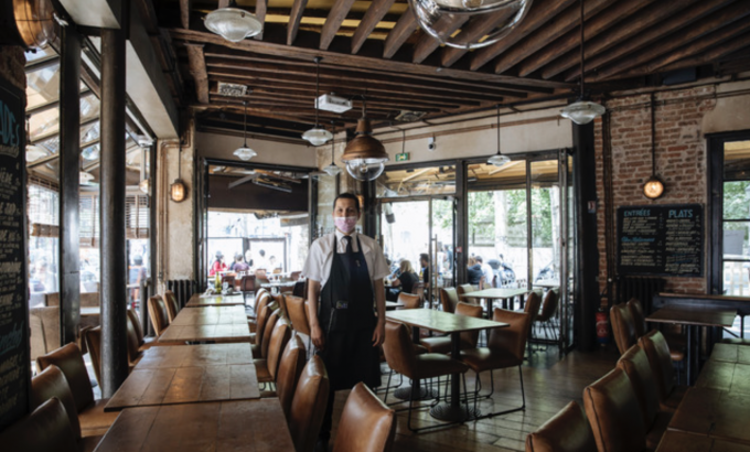 프랑스의 코로나19 봉쇄 완화 조치를 하루 앞둔 8일(현지시간) 파리의 한 식당이 영업 준비를 하고 있다. 프랑스는 9일부터 식당, 체육관 등의 실내 영업을 허용하고 통행 금지 시간도 밤 9시에서 11시로 완화하며 백신 접종이나 음성 확인 증명서를 소지한 외국인 관광객의 입국을 허용한다. [AP 뉴시스]