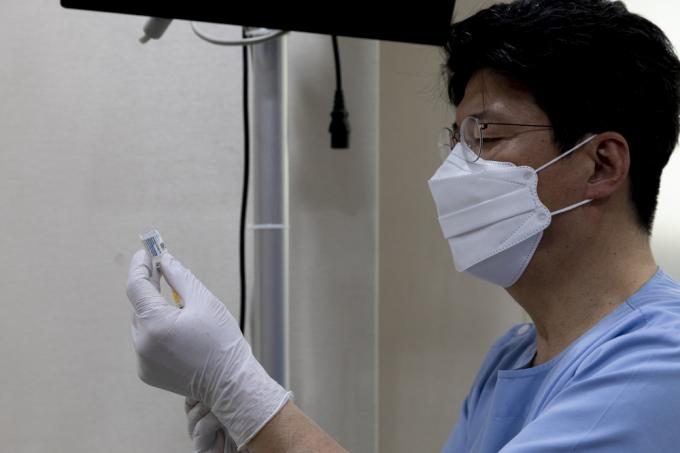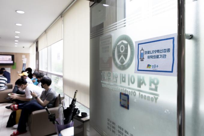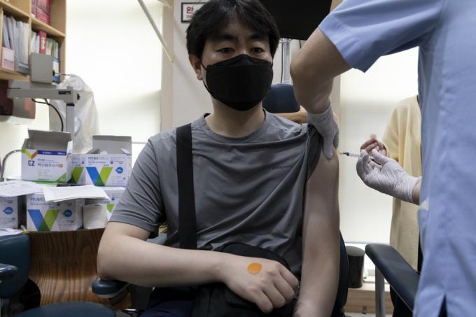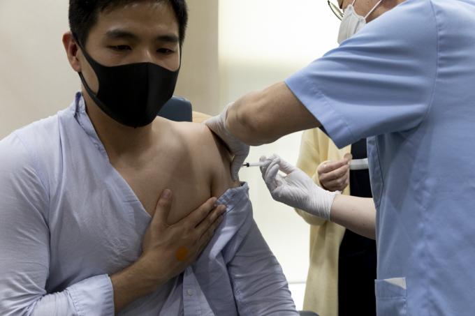 얀센 백신 접종이 시작된 10일 서울 성동구의 한 '코로나19 백신 접종 위탁 의료기관'에서 한 시민이 얀센 백신을 맞고 있다. 얀센 백신 접종 대상은 30세 이상 60세 미만 예비군, 민방위 대원, 국방·외교 관련 종사자 등 89만4000명이다.