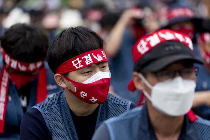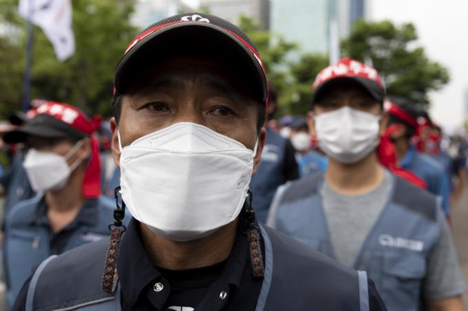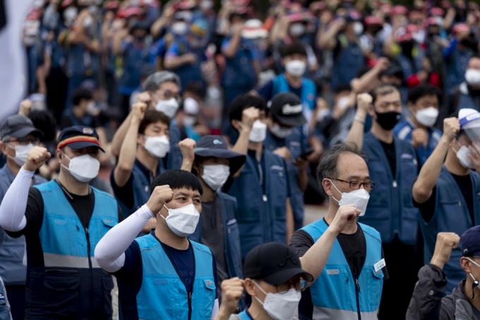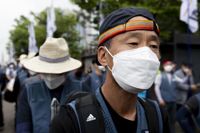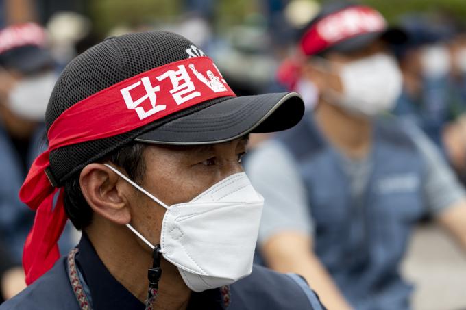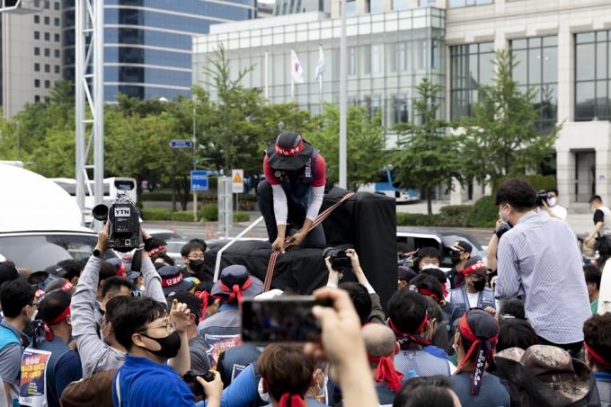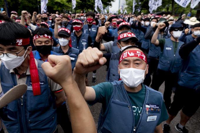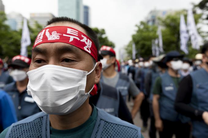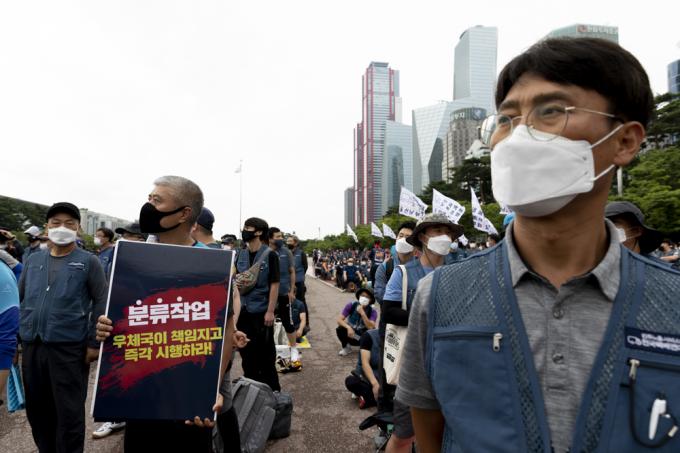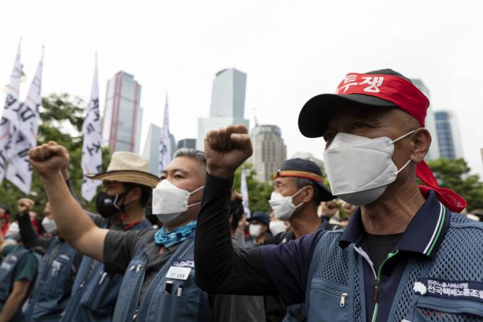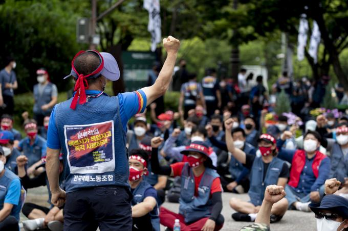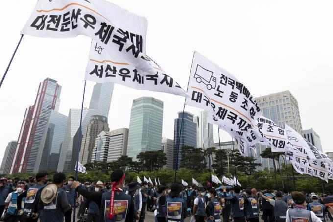 '택배 시장'은 이 시대 가장 치열한 노동현장이다. 열악한 근무 여건속에서 살인적 노동을 감내하다 스러지는 택배 노동자들이 꼬리를 문다. 전국 택배 노동조합의 무기한 파업이 이어지고 있는 15일 서울 여의도 공원에서 택배노조합원들이 '택배 노동자들의 분류작업을 금지한 사회적 합의 이행 촉구 결의 대회'에서 구호를 외치고 있다.
