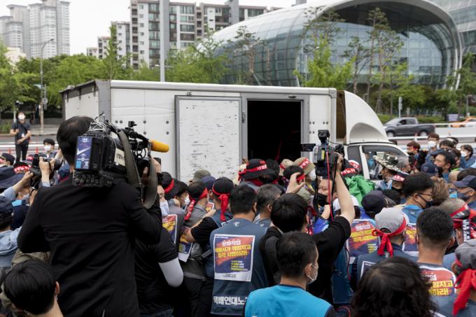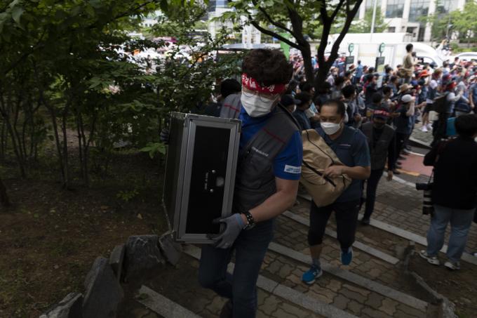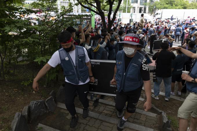 15일 서울 여의도 공원에서 택배노조합원들이 '택배 노동자들의 분류작업을 금지한 사회적 합의 이행 촉구 결의 대회'중 경찰과의 대치 속에서 집회 장비를 옮기고 있다.