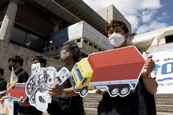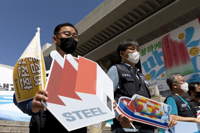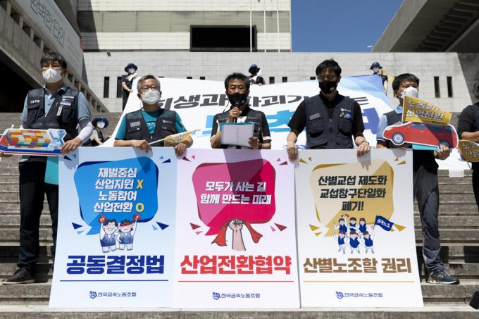 16일 오전 서울 세종문화회관 앞에서 전국금속노동조합 관계자들이 '희생과 파괴가 없는 노동참여 산업전환 촉구 기자회견'을 하고 있다.
