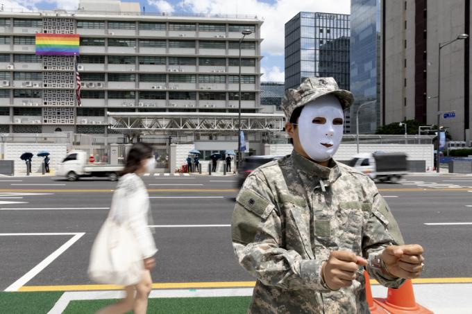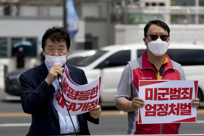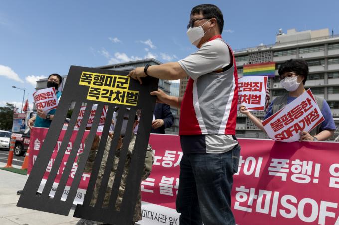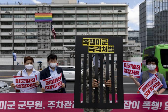 '불평등한 한미SOFA개정 국민연대'가 16일 오후 서울 종로 주한미대사관 앞에서 '술취한 미군 군무원, 주차관리노동자 마구잡이 폭행 엄정 처벌 촉구, 미군범죄 초동수사 가로막는 불평등한 한미소파 개정 촉구' 기자회견 중 범죄를 저지른 미군에게 수갑을 채우는 퍼포먼스를 하고 있다.