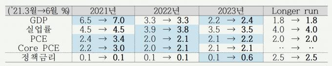 연준은 올해 미국의 경제성장률을 7.0%로 상향 조정했다. 지난 3월 전망했던 6.5%보다 0.5%포인트 높인 것이다. 물가상승률 전망치도 종전 2.4%에서 3.4%로 올렸다. 실업률 전망치는 4.5%로 유지했다.