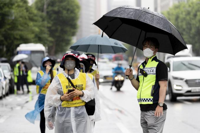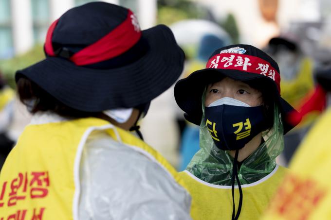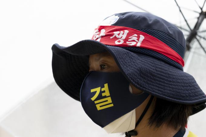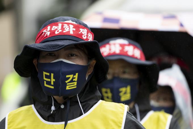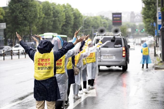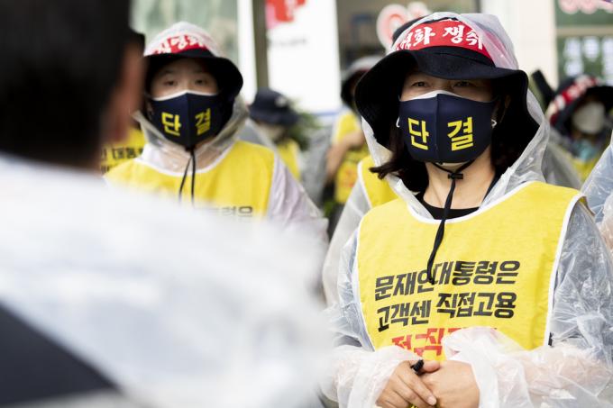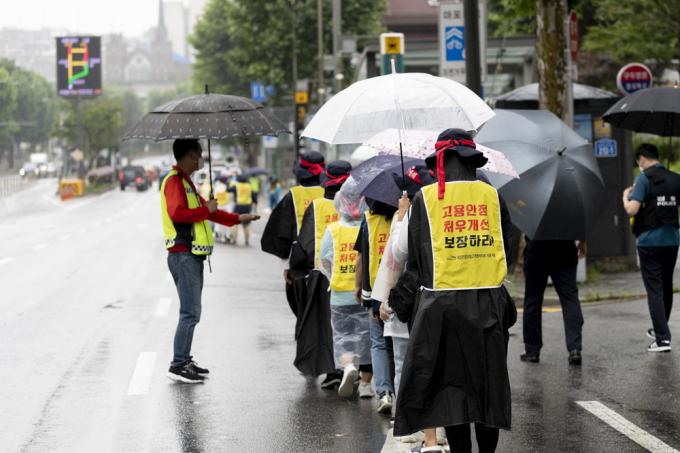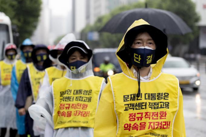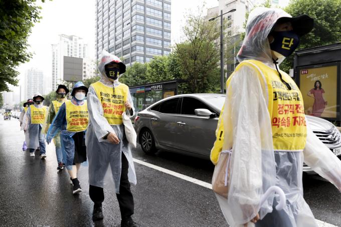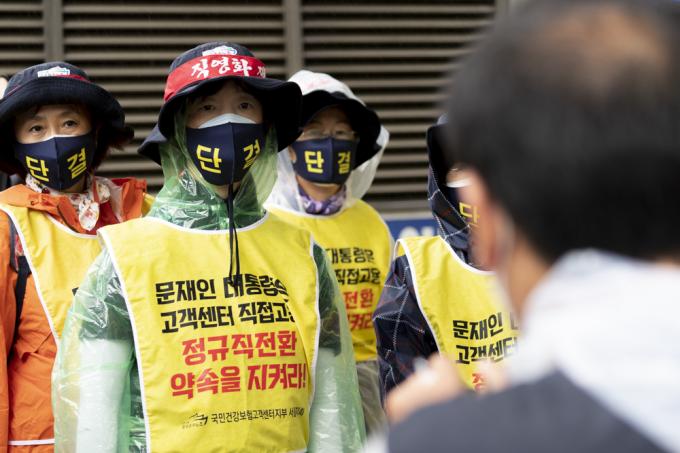 18일 서울 마포구 애오개역 인근에서 국민건강보험 고객센터지부 노동조합원들이 '정규직 전환 촉구 행진'을 하고 있다.