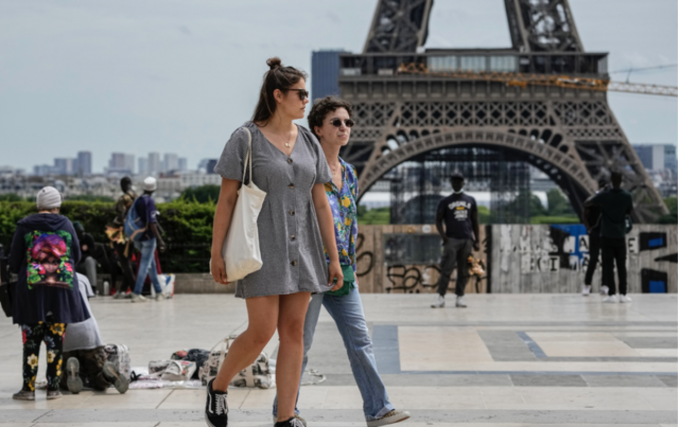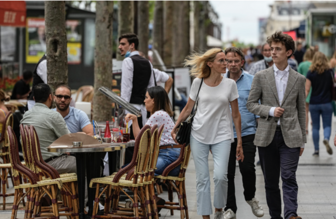 프랑스 정부가 실외 마스크 의무화를 해제한 17일(현지시간) 파리 트로카데로 광장에서 시민들이 마스크 없이 활보하고 있다. 프랑스는 이번 주말 밤부터는 8개월간의 통행금지 조치도 해제한다고 밝혔다. [AP 뉴시스]