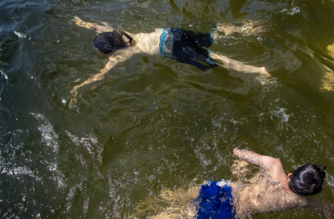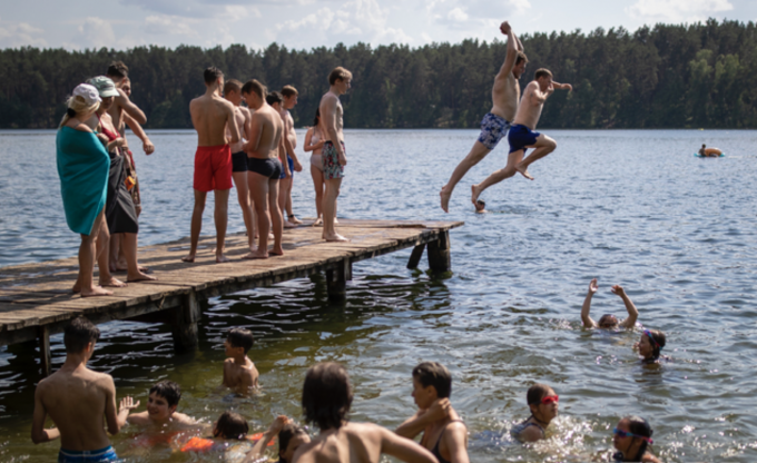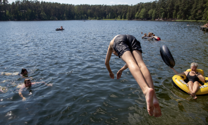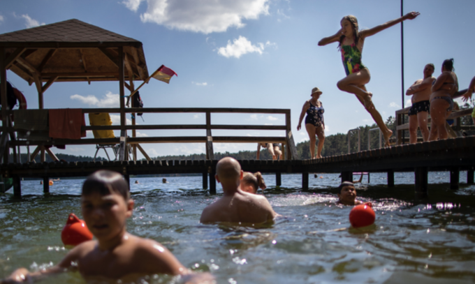 20일(현지시간) 리투아니아 수도 빌니우스 인근의 한 호수에서 시민들이 물놀이를 즐기며 더위를 식히고 있다. [AP 뉴시스]