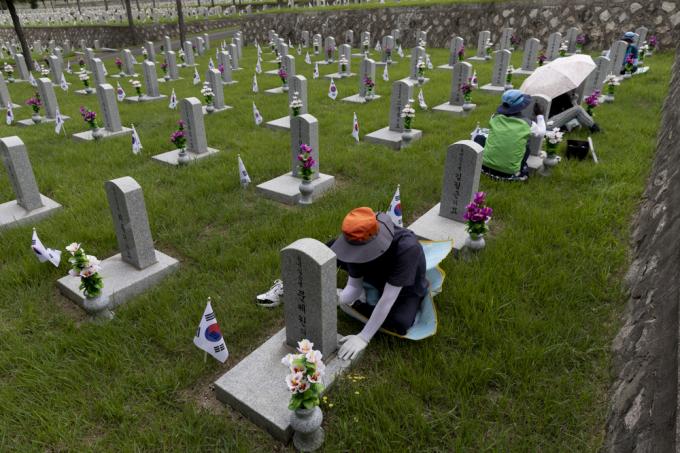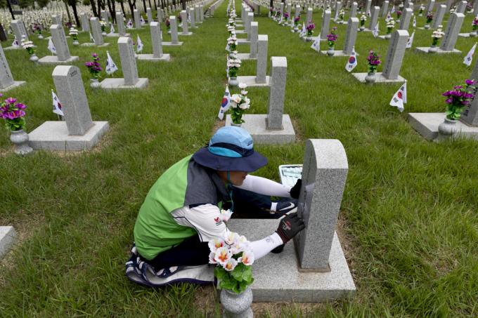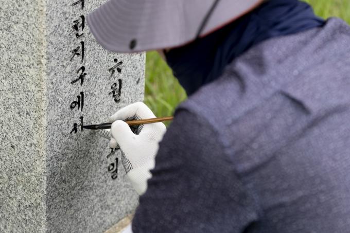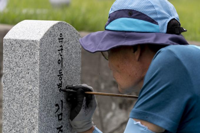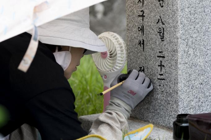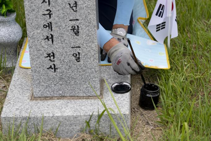 6·25 전쟁 71주년을 사흘 앞둔 22일 오후 국립서울현충원 6·25 전사자 묘역에서 서울동작50플러스센터 관계자들이 묘비명 덧칠 작업을 하고 있다.