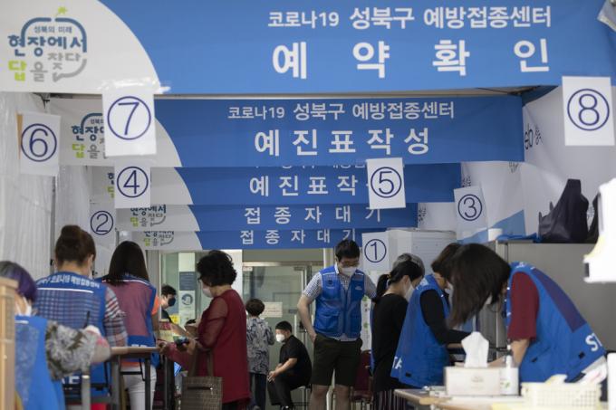 24일 서울 성북구 예방접종센터에서 시민들이 화이자 백신 접종 예약 확인을 하고 있다. 코로나19 예방접종대응추진단에 따르면 이달 중 아스트라제네카 백신 접종을 받지 못한 60~74세 고령자와 만성 중증 호흡기질환자 약 20만 명은 다음 달 5~17일 전국 예방접종센터에서 화이자 백신을 접종받게 된다.