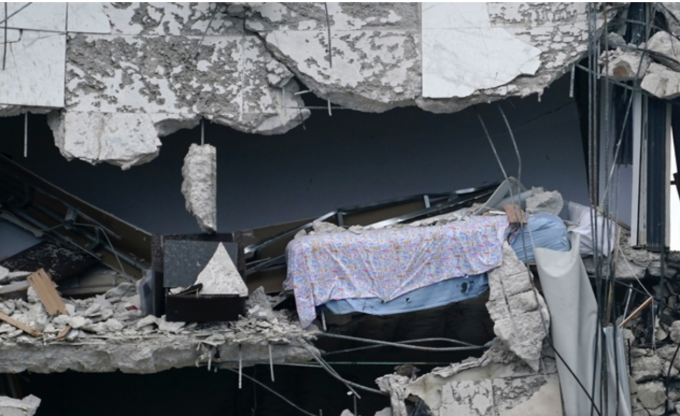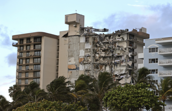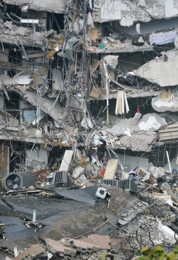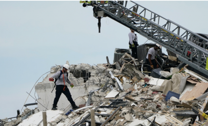 24일(현지시간) 미 플로리다주 마이애미데이드 카운티 서프사이드에서 12층의 챔플레인 타워 사우스 아파트가 무너져 구조대가 실종자 수색 작업을 하고 있다. [AP 뉴시스]