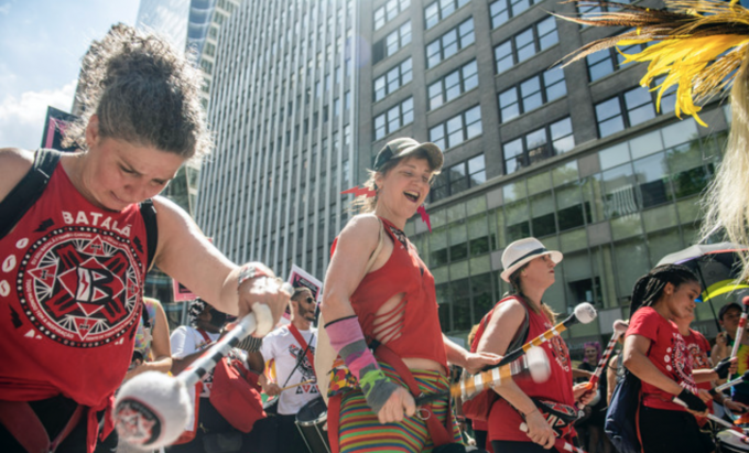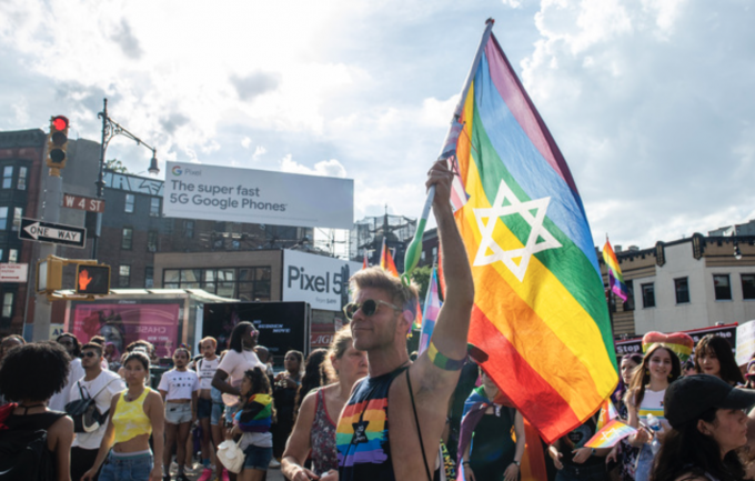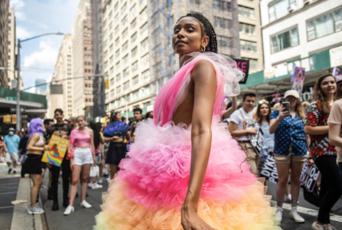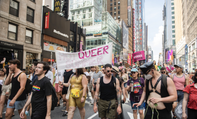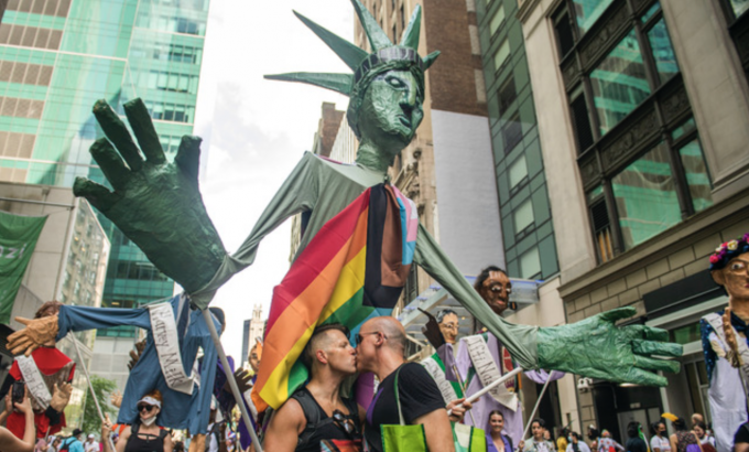 27일(현지시간) 미국 뉴욕에서 열린 퀴어(성소수자) 해방 행진에서 한 동성 부부가 키스하고 있다. [AP 뉴시스]