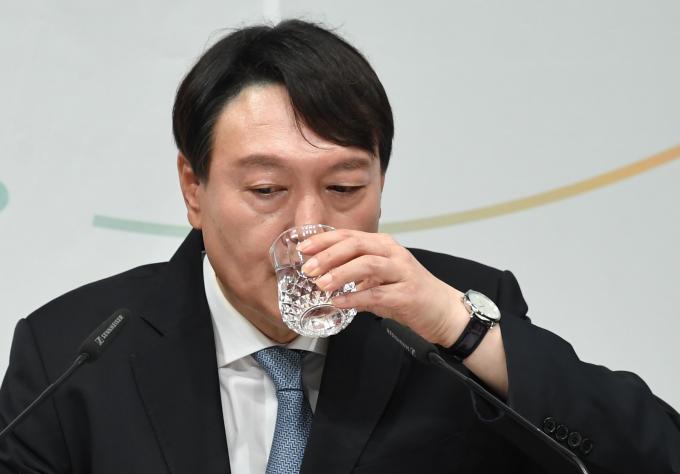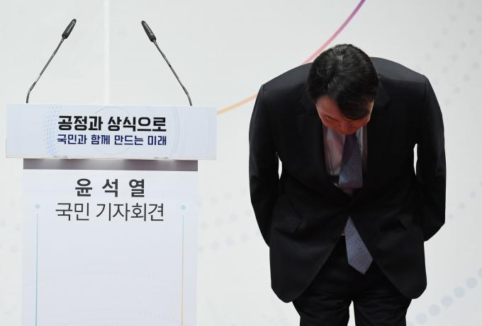 윤석열 전 검찰총장이 29일 오후 서울 서초구 매헌 윤봉길 의사 기념관에서 대선 출마 선언을 한 뒤 기자 질의에 답하고 있다. [공동취재사진]