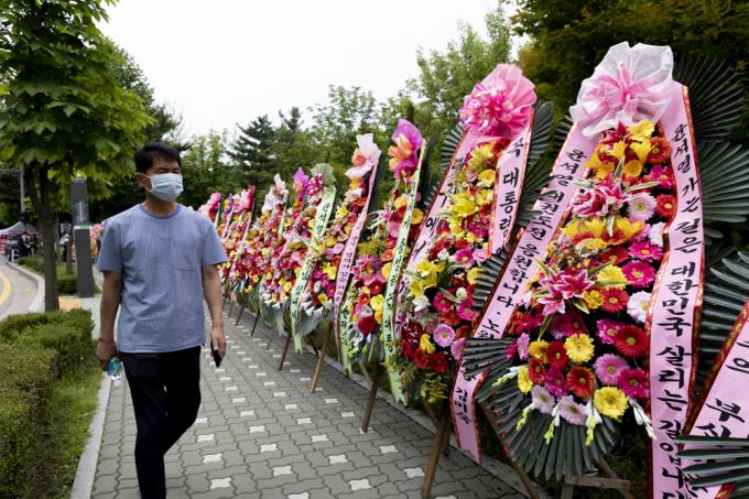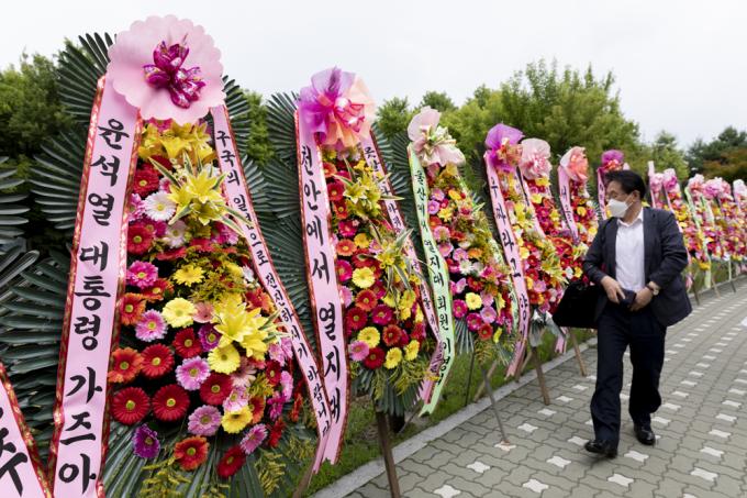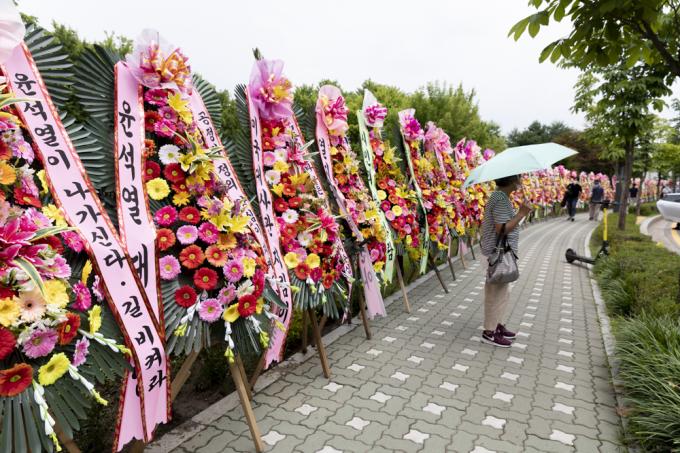 윤석열 전 검찰총장의 대선 출마 선언 기자회견이 29일 오후 서울 서초구 매헌 윤봉길 의사 기념관에서 열린 가운데 기념관 주변 인도에 윤 전 총장 응원 화환이 놓여 있다.