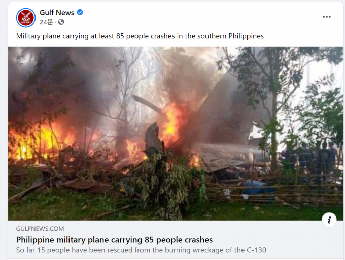▲ 4일 필리핀의 군 수송기 사고 소식을 전한 걸프뉴스의 페이스북 화면. [페이스북 캡처]