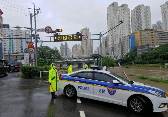 부산경찰청 등에 따르면 집중호우로 인해 세병교, 연안교, 수연교, 영락지하차도, 초량1·2지하차도 출입이 현재 금지되고 있다. 영도구 중리해안가 100m 구간도 산에서 내려오는 빗물로 인해 일시 통제됐다가 오후 3시께 해제됐다.