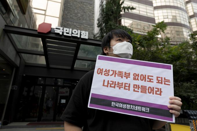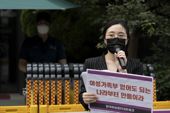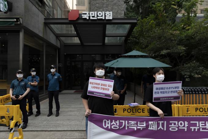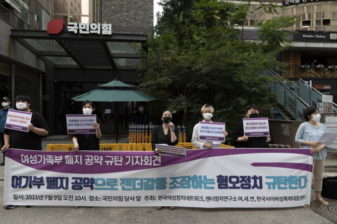 9일 서울 여의도 국민의힘 당사 앞에서 한국여성정치네트워크, 한국사이버성폭력대응센터, 젠더정치연구소 여.세.연 관계자들이 '국민의힘 여성가족부(여가부) 폐지 공약 규탄' 기자회견을 하고 있다.