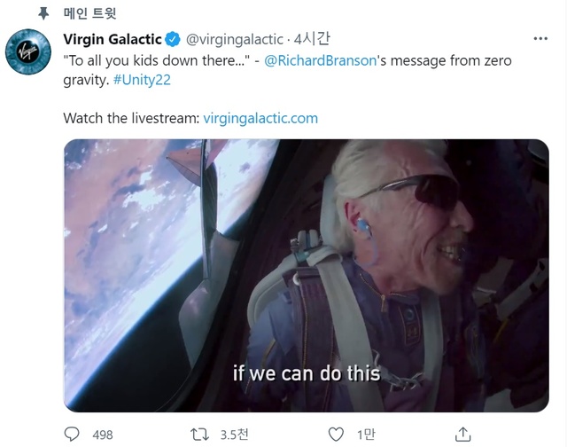 이에 앞서 브랜슨 회장은 11일 오전 7시 40분께(미 서부시간) 자신이 창업한 버진 갤럭틱의 우주 비행선 'VSS 유니티'를 타고 하늘로 날아올랐다.