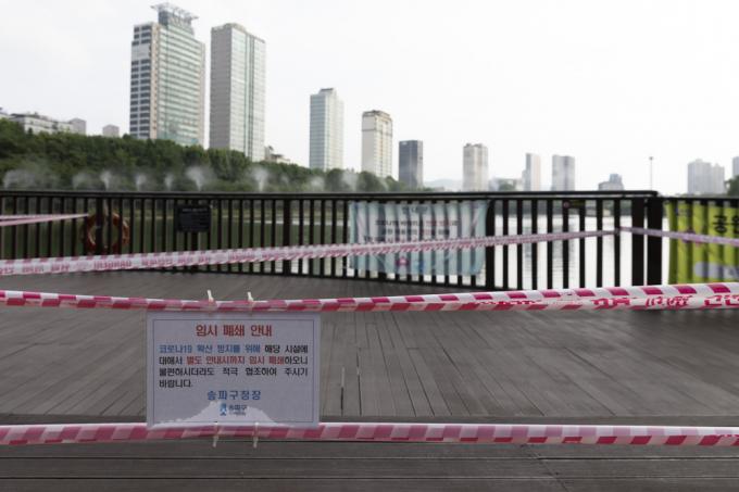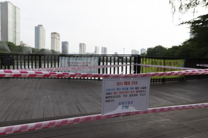 수도권 거리두기 4단계 시행 첫날인 12일 서울 송파구 석촌호수 다중이용시설에 폐쇄 안내문이 붙어 있다. 송파구는 지난 8일 야간에 인파가 몰리는 유흥시설 주변 공원과 석촌호수 다중이용시설을 폐쇄한다고 밝혔다.