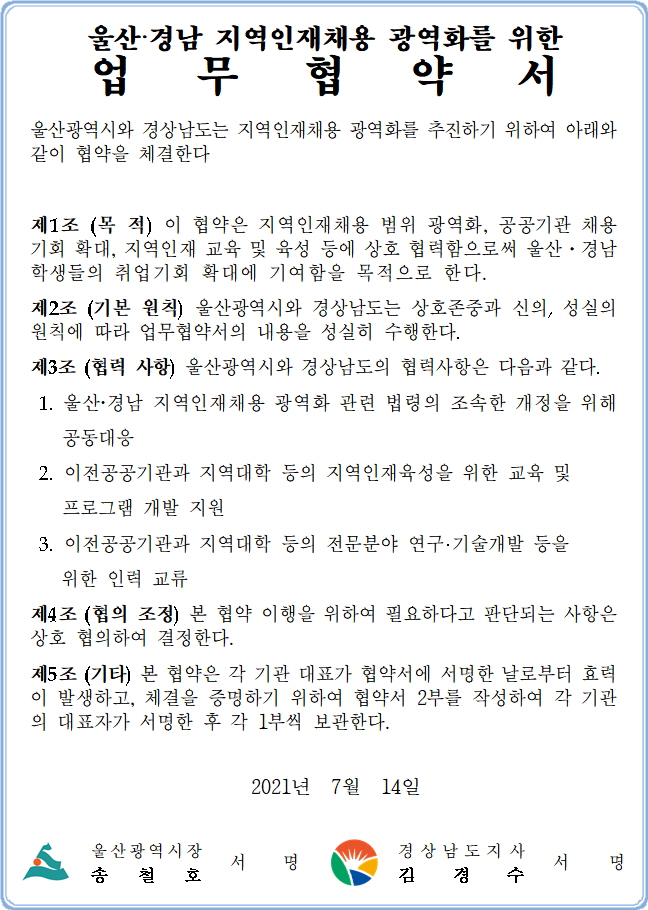 김경수 경남도지사와 송철오 울산시장은 14일 울산・경남 지역인재 채용 광역화를 위한 업무협약을 체결한다.