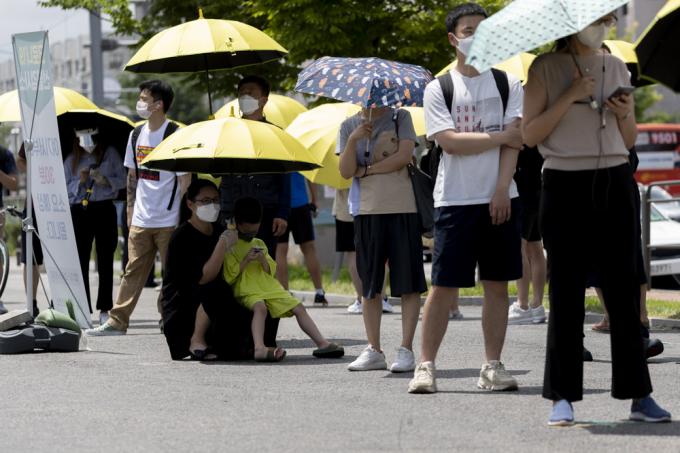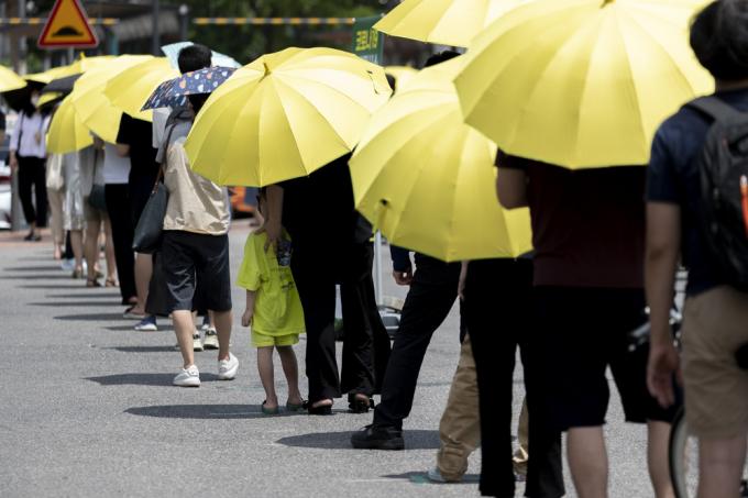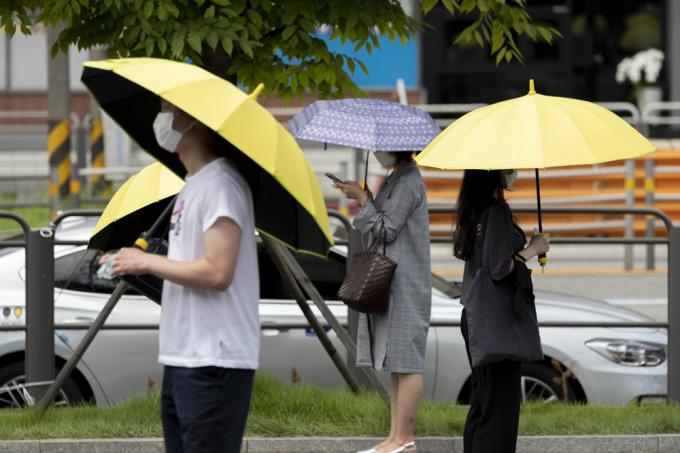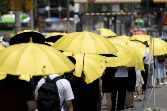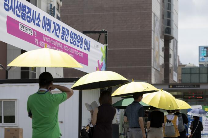 체감 온도 35도 안팎의 폭염이 몰려온 14일 서울 서초구 고속터미널 인근 선별진료소에서 코로나19 검사를 받으려는 시민들이 진료소 제공 양산을 쓰고 대기하고 있다. 코로나19 신규 확진자는 0시 기준 1615명으로 확인됐다.