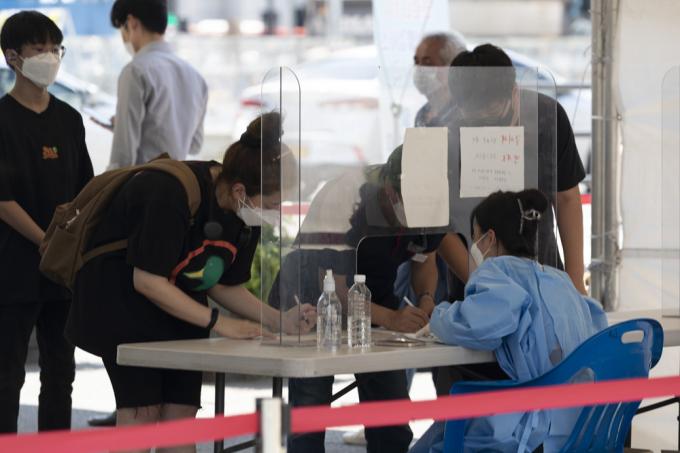 코로나19 신규 확진자 수가 0시 기준 1600명으로 확인된 15일 서울역 코로나19 임시 선별진료소에 검사를 받으려는 시민들이 줄지어 서 있다.