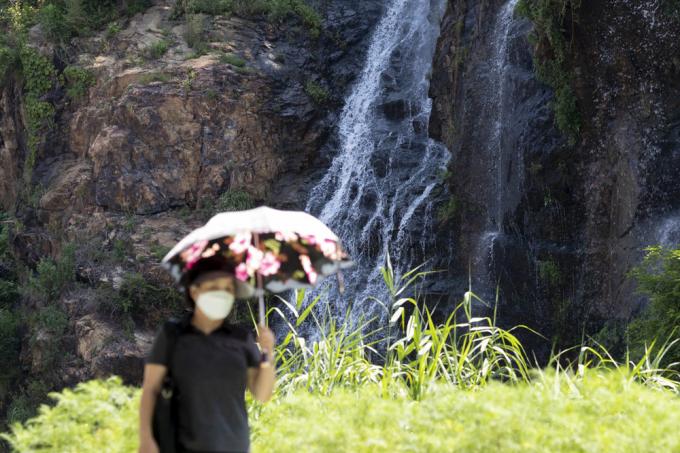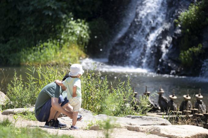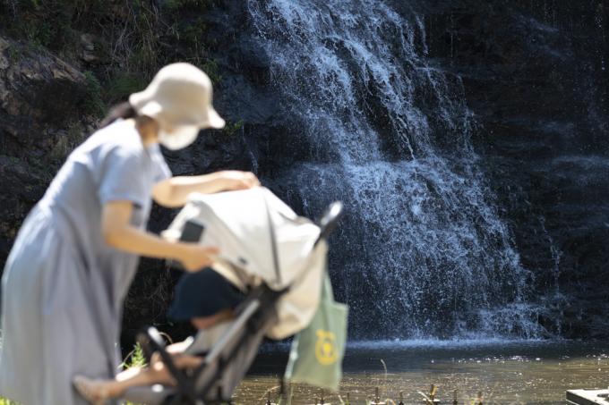 서울 한낮 기온이 34도에 육박하는 폭염이 이어지는 16일 서울 서대문구 홍제천 인공폭포 풍경. 아기를 데리고 나온 어머니가 유모차 덮개를 펴고 있다.