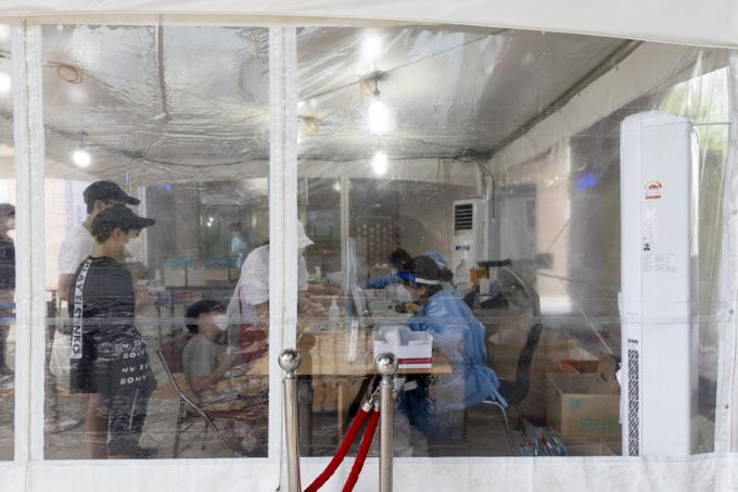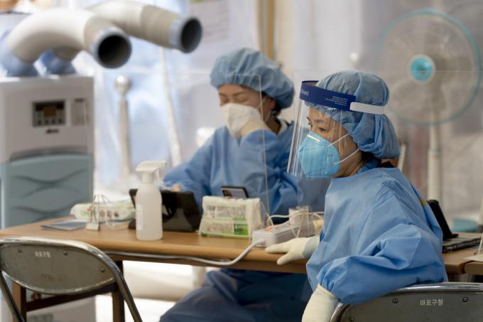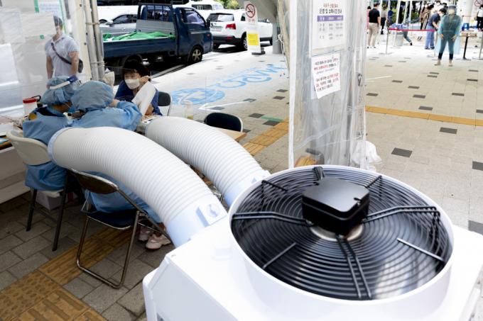 서울의 한낮 기온이 34도에 육박하는 폭염이 이어지고 있는 16일 서울 마포구 보건소 내 선별진료소. 방호복을 입은 의료진 뒤편으로 냉방기가 쉴 새 없이 가동되고 있다. 이날 코로나19 신규 확진자 수는 0시 기준 1536명으로 확인됐다.