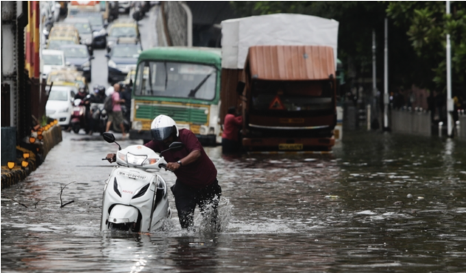 16일(현지시간) 폭우로 물에 잠긴 인도 뭄바이의 거리에서 한 남성이 스쿠터를 끌고 가고 있다. [AP 뉴시스]