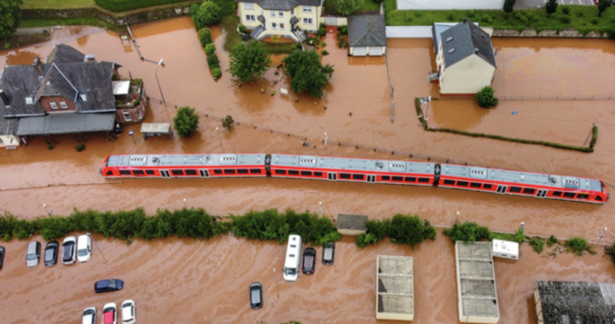 15일(현지시간) 독일 라인란트팔츠주 코르델 지방 인근 킬 강의 수위가 높아지면서 범람해 지역 기차역이 물에 잠겨 있다. 독일에서는 이번 대홍수로 사망자가 93명까지 늘었다. 1300여 명은 연락이 두절된 상태다. [AP 뉴시스]