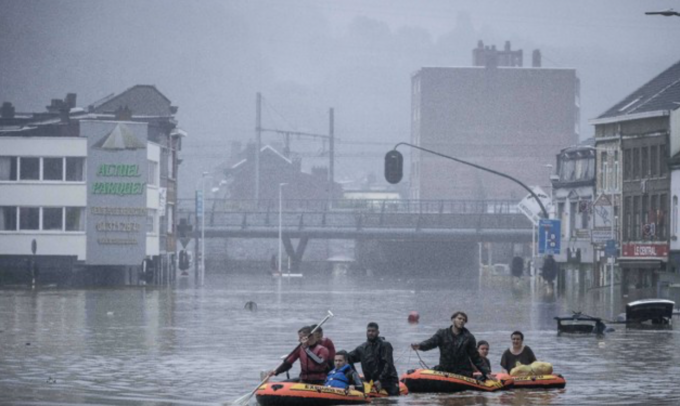 15일(현지시간) 벨기에 리에주에 내린 폭우로 뫼즈강 제방이 무너지면서 홍수가 발생해 시민들이 고무보트를 타고 대피하고 있다. 벨기에는 이번 홍수로 최소 15명이 숨지고 주요 고속도로와 철도 운행이 중단되는 등 피해가 늘고 있다.