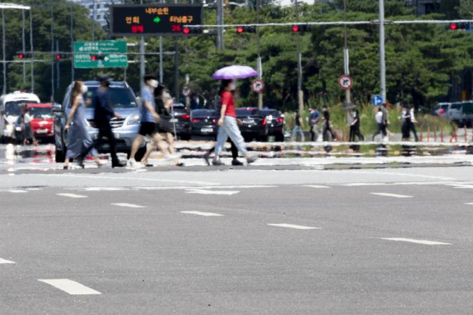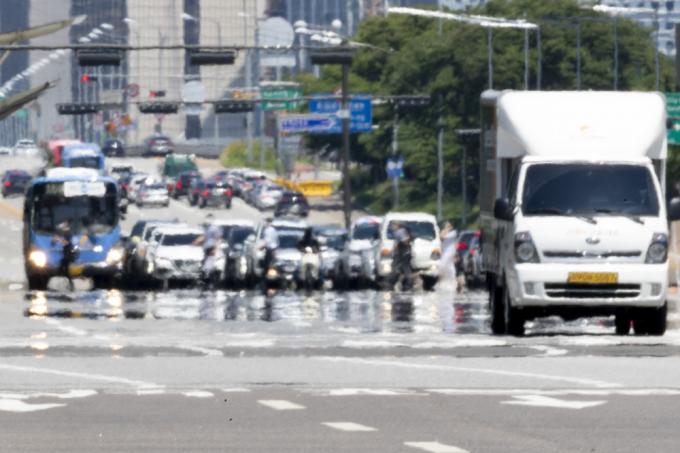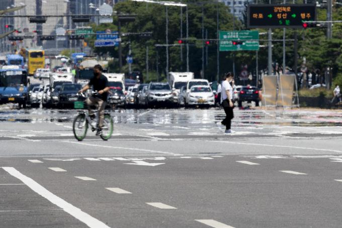 절기상 가장 덥다는 '대서'인 22일 서울 여의대로 일대. 복사열로 아지랑이가 솟아오르며 시야를 일그러뜨린다. 이날 서울의 한낮 최고 기온은 36도로 치솟았다. 전국 대부분 지역엔 폭염특보가 발효됐다.