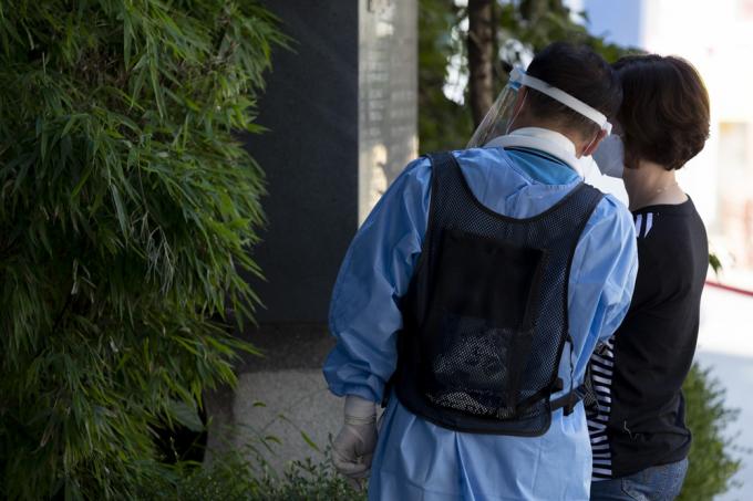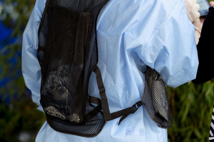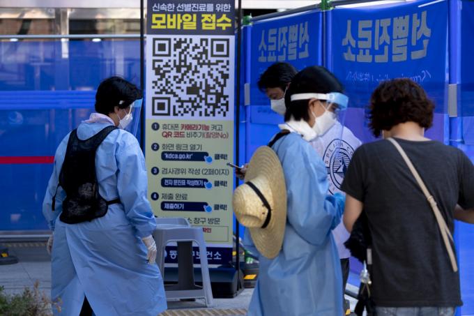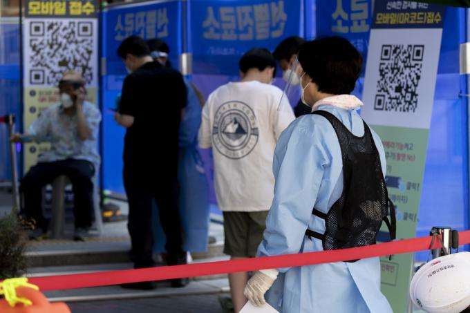 절기상 가장 덥다는 '대서'인 22일 서울 동작구 보건소 내 선별진료소에서 의료진이 폭염속에 업무를 수행하고 있다. 아이스팩 재킷(왼쪽)과 밀짚 모자까지 동원했지만 폭염을 견디기엔 턱없어 보인다.