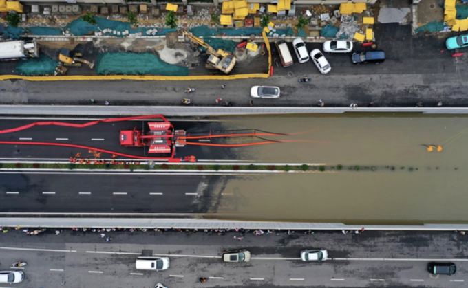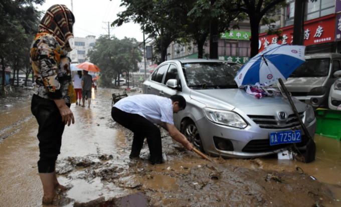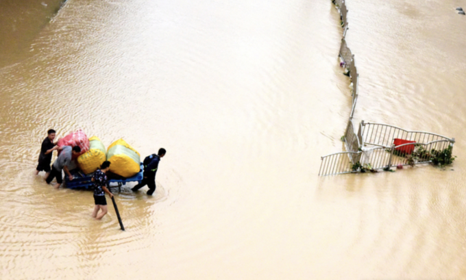 21일 중국 허난성 정저우에서 시민들이 수레에 살림살이 등을 싣고 홍수로 잠긴 거리를 건너고 있다. 허난성 당국에 따르면 이번 홍수로 33명이 숨지고 8명이 실종됐다. [AP 뉴시스]