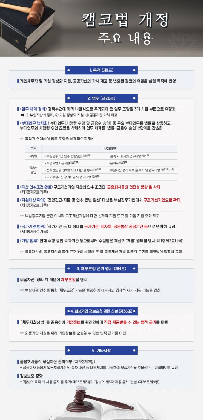세부적으로는 코로나19 등으로 어려움에 처한 가계와 기업에 대한 재기지원과 국·공유 재산 관리·개발 등 경제 3주체인 가계·기업·공공부문에서의 캠코 역할을 명확히 담았다. 부실채권 인수를 통한 '채무조정' 기능을 반영, 채무자의 경제적 재기 지원 기능도 강화했다.