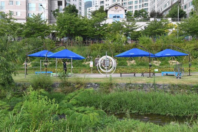 기장군은 정관읍 병산저수지에서 임랑해수욕장까지 좌광천 14㎞ 전 구간에 대형그늘막 100개, 평상 100개, 그네의자 70여 점, 운동기구 30여 점을 설치하는 힐링공간 사업을 벌이고 있다고 28일 밝혔다.
