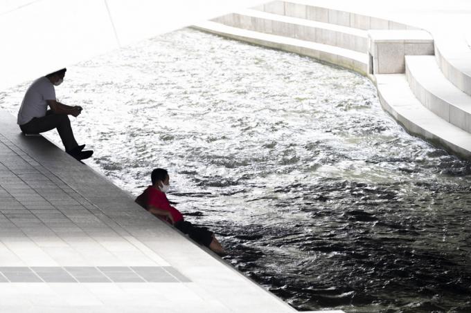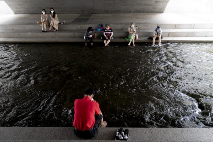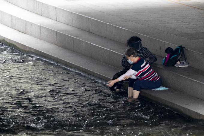 연일 폭염이 이어지고 있는 28일 서울 종로구 청계천에서 시민들이 발을 담그며 더위를 식히고 있다.