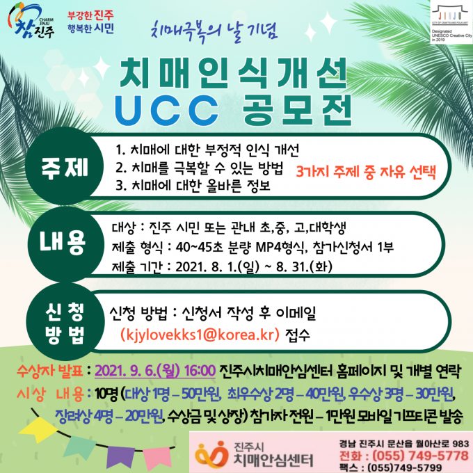 진주시는 지난해에도 치매극복의 날을 기념해 치매예방 UCC , 치매인식개선 봉사 활동 우수사례 등 2가지 분야의 공모전을 실시해 수상 작품들을 홍보 콘텐츠로 적극 활용됐다.