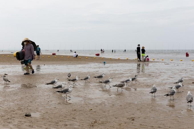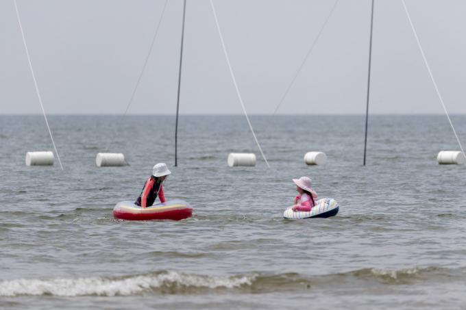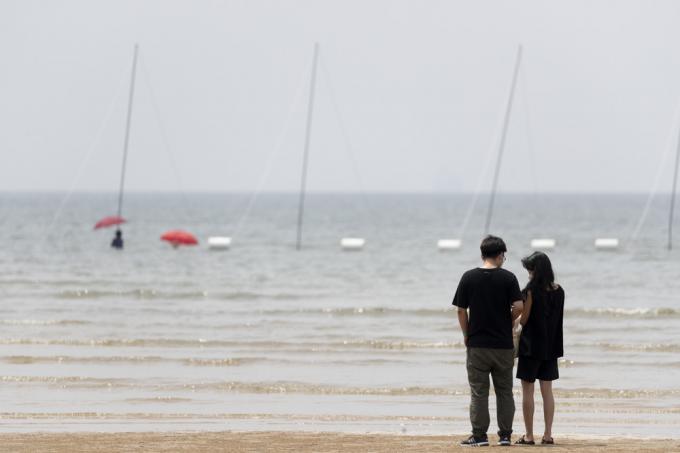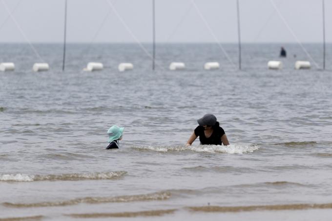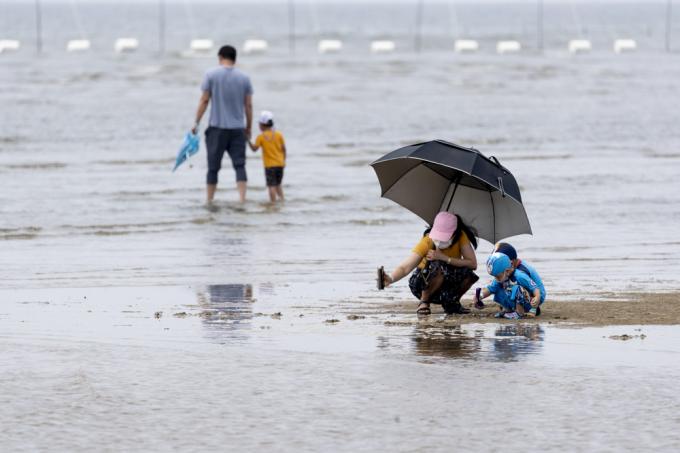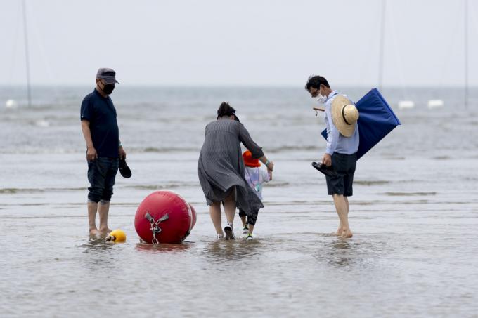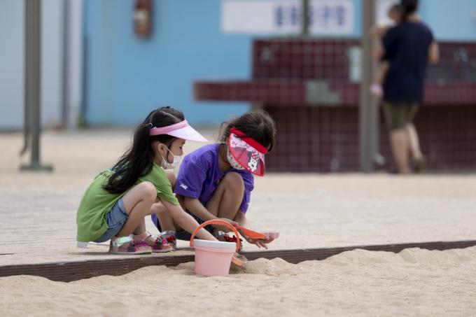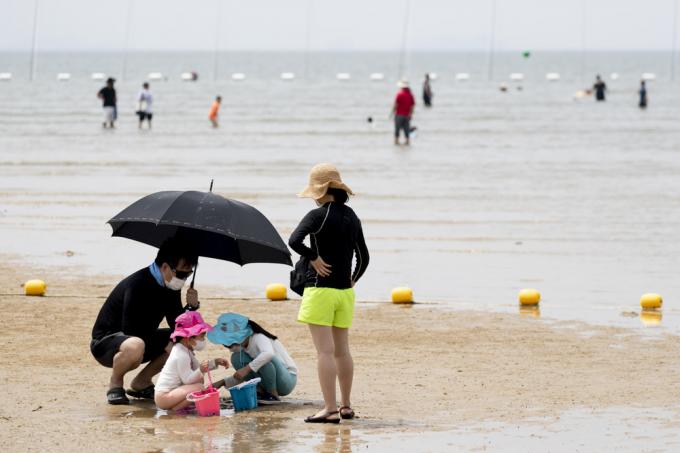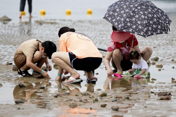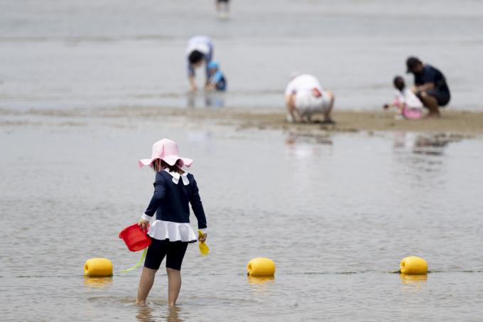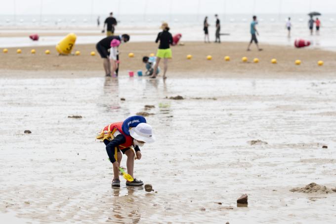 휴가철인 4일 인천 중구 하나개해수욕장에서 마스크를 쓴 한 아이가 갯벌 체험을 하고 있다.