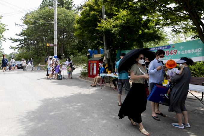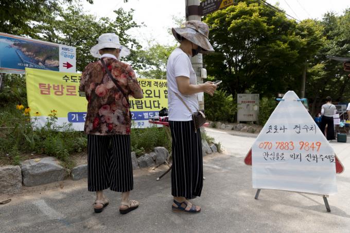 체온 측정과 방문자 등록을 하고 있는 시민들.
