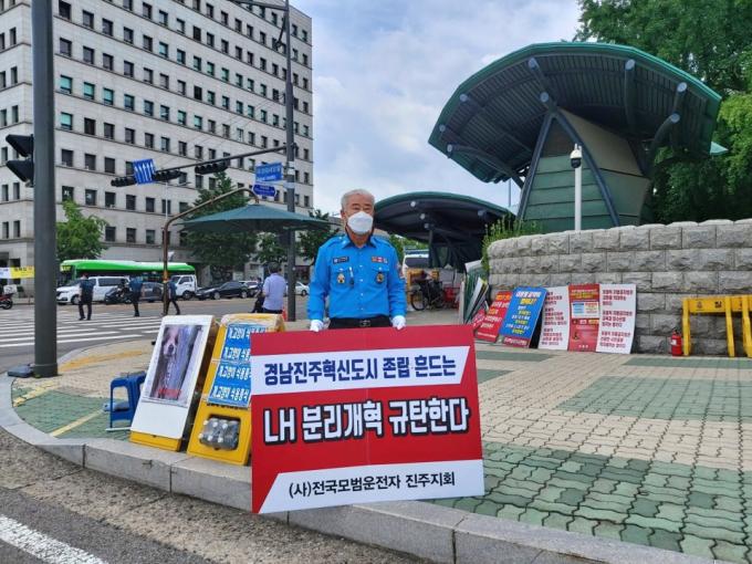 4일 1인 시위에 나선 고무열 모범운전자연합회 진주지회장은 "지역경제가 살아야 우리 같은 봉사단체도 지역민을 위해 신명나게 봉사 활동을 펼칠수 있다"며 "지역경제를 죽이고 청년 일자리를 빼앗는 LH 해체안이 철회되고 합리적인 혁신안이 나올 때까지 함께 투쟁하겠다"고 강조했다.