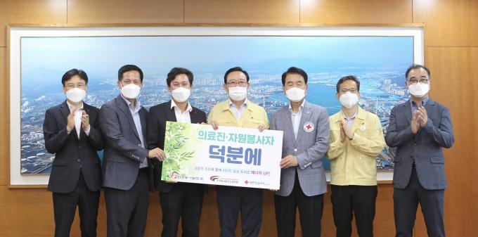 5일 동서발전에 따르면 전날 울산시청에서 김영문 동서발전 사장, 김성관 동서노조 위원장, 송철호 울산시장, 김철 대한적십자사 울산지사장 등이 참석한 가운데 '의료진·자원봉사자, 덕분에 고맙소!!!'라는 슬로건을 내걸고 전달식을 가졌다.