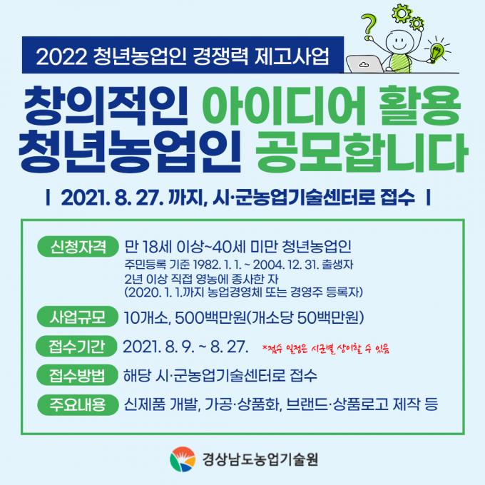 경남도농업기술원은 청년 농업인의 성공모델을 구축, 영농 조기정착 및 농촌유입을 유도하기 위해 '2022 청년농업인 경쟁력 제고사업' 대상자를 공모한다고 9일 밝혔다.