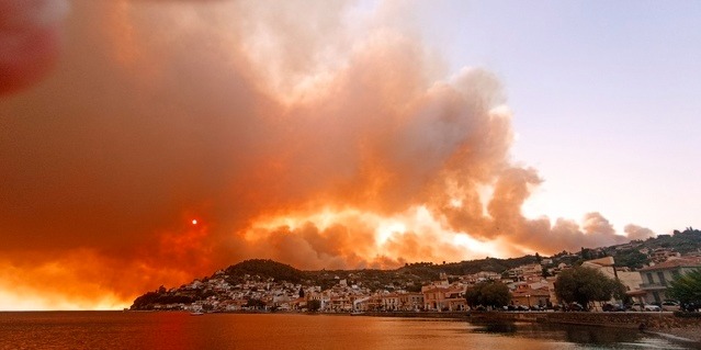 아테네에서 북쪽으로 150㎞ 떨어진 에비아 섬이 8일째 붉은 화마에 뒤덮였다. 그리스에서 두 번째로 큰 섬이자 아름다운 관광지라는 게 믿어지지 않을 정도다. 연기와 재가 본토까지 뒤덮었다. 그리스 정부는 항공기 11대와 소방관 650명을 투입해 진화에 나서고 있지만 불길은 쉽게 잡히지 않고 있다. 가옥 등 시설물 수백 채가 붕괴됐고, 대지는 300㎢ 이상 전소됐다. 주민과 관광객 2000여 명에게는 대피 지시가 내려졌다.
