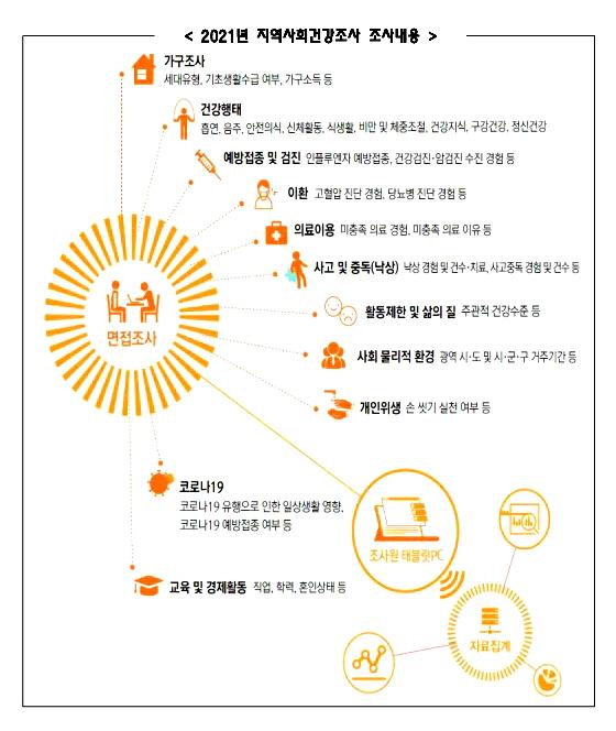 올해 조사 설문은 흡연·음주·신체활동 등 건강행태와 고혈압·당뇨병 등 만성질환, 백신 접종 여부 등 코로나19 관련 문항으로 구성돼 있다.