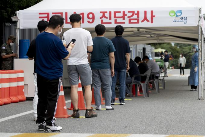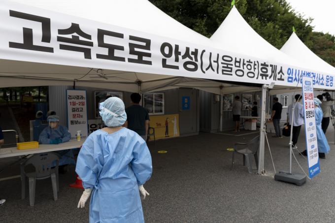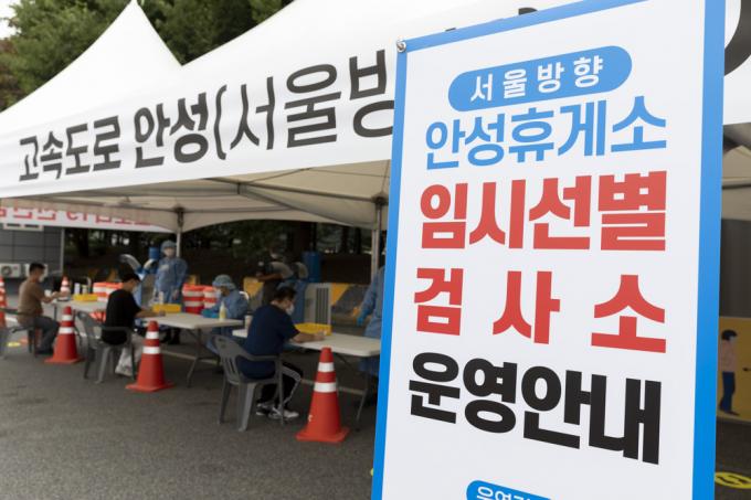 13일 경부고속도로 안성 휴게소(서울방면)에 마련된 코로나19 임시선별검사소에서 시민들이 검사를 받고 있다.